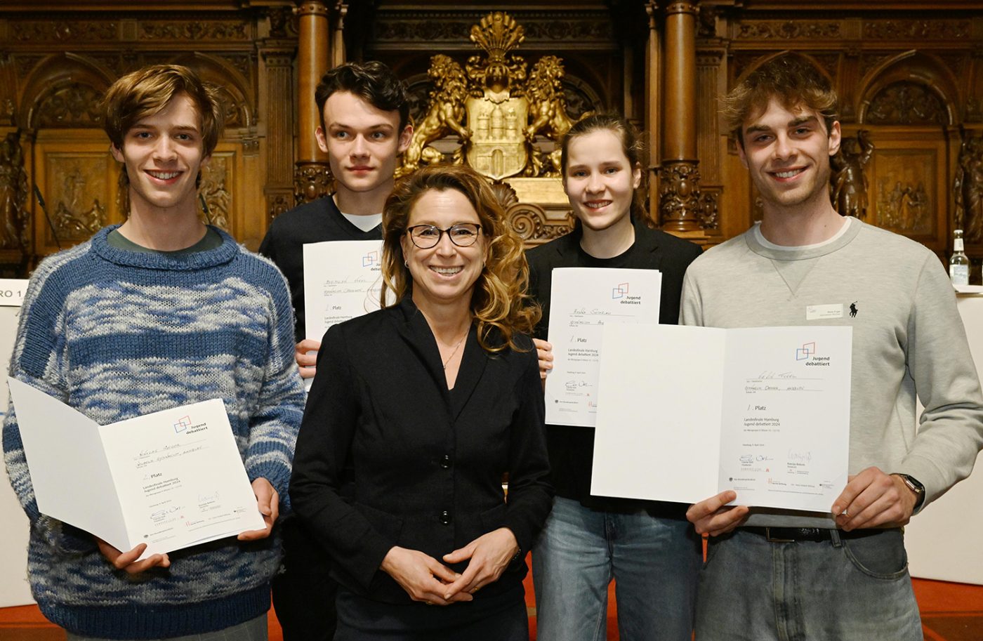 Die Jury zog sich für eine Weile zurück und verkündete feierlich die Platzierung der Top-4-Debattant:innen Hamburgs. Hanna konnte mit ihren Leistungen nicht nur das Publikum, sondern auch die Jury begeistern und wurde am Ende zur Hamburger Siegerin von Jugend debattiert. Als Preis und zur Vorbereitung auf das Bundesfinale wurde Hanna auf das Landessieger:innenseminar auf Burg Rotenfels eingeladen. Für sie geht es anschließend vom 6. bis zum 8. Juni nach Berlin zum Bundesfinale. Wir drücken ihr die Daumen und wünschen viel Erfolg!