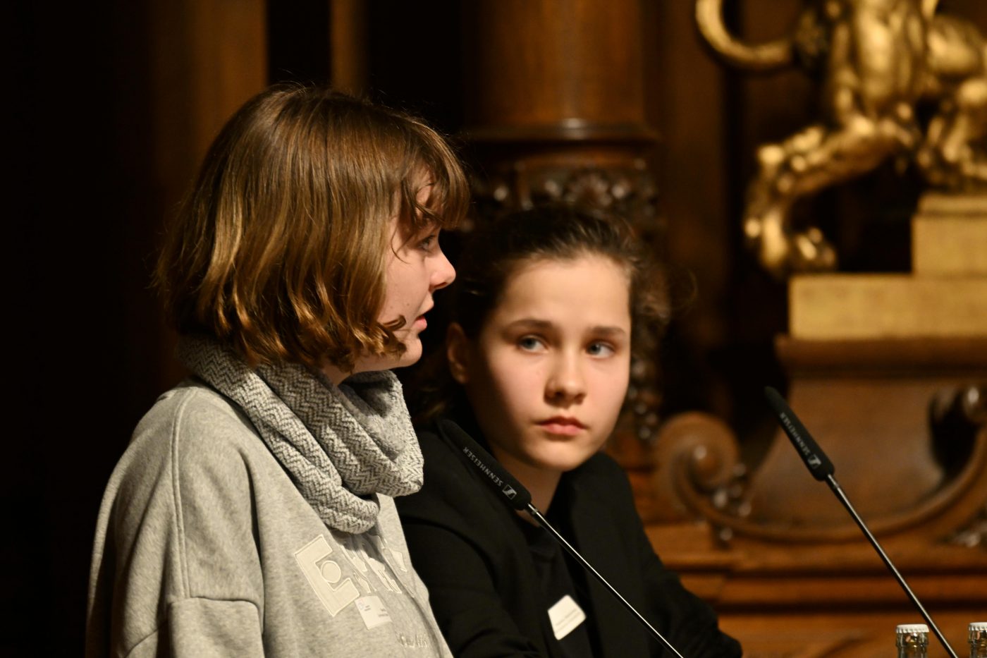 Für Hanna ging es dann am 9. April weiter ins Rathaus zum Landesfinale, bei dem insgesamt zehn Verbünde teilnahmen. Von jedem Verbund hatten sich die besten zwei Debattant:innen der Altersgruppe 1 (Klasse 9) und 2 (Oberstufe) für das Landesfinale qualifiziert und so waren es ganze 40 Teilnehmer:innen im Rathaus. Alle Debattant:innen mussten an zwei Qualifikationsdebatten teilnehmen, bei denen sie die Themen schon im Voraus kannten, ihre Positionierung allerdings erst ein paar Stunden vorher mitgeteilt bekommen hatten. Gegen Mittag wurden dann vor ca. 400 Menschen im Hauptsaal des Rathauses feierlich die acht Sieger:innen der zwei Altersgruppen bekannt gegeben, die direkt im Anschluss vor Ort im Hauptsaal ein letztes Mal gegeneinander debattierten. Die Altersgruppe 1 befasste sich mit der Frage: “Sollen Jugendräte verpflichtend auf kommunaler Ebene in Hamburg eingeführt werden?”