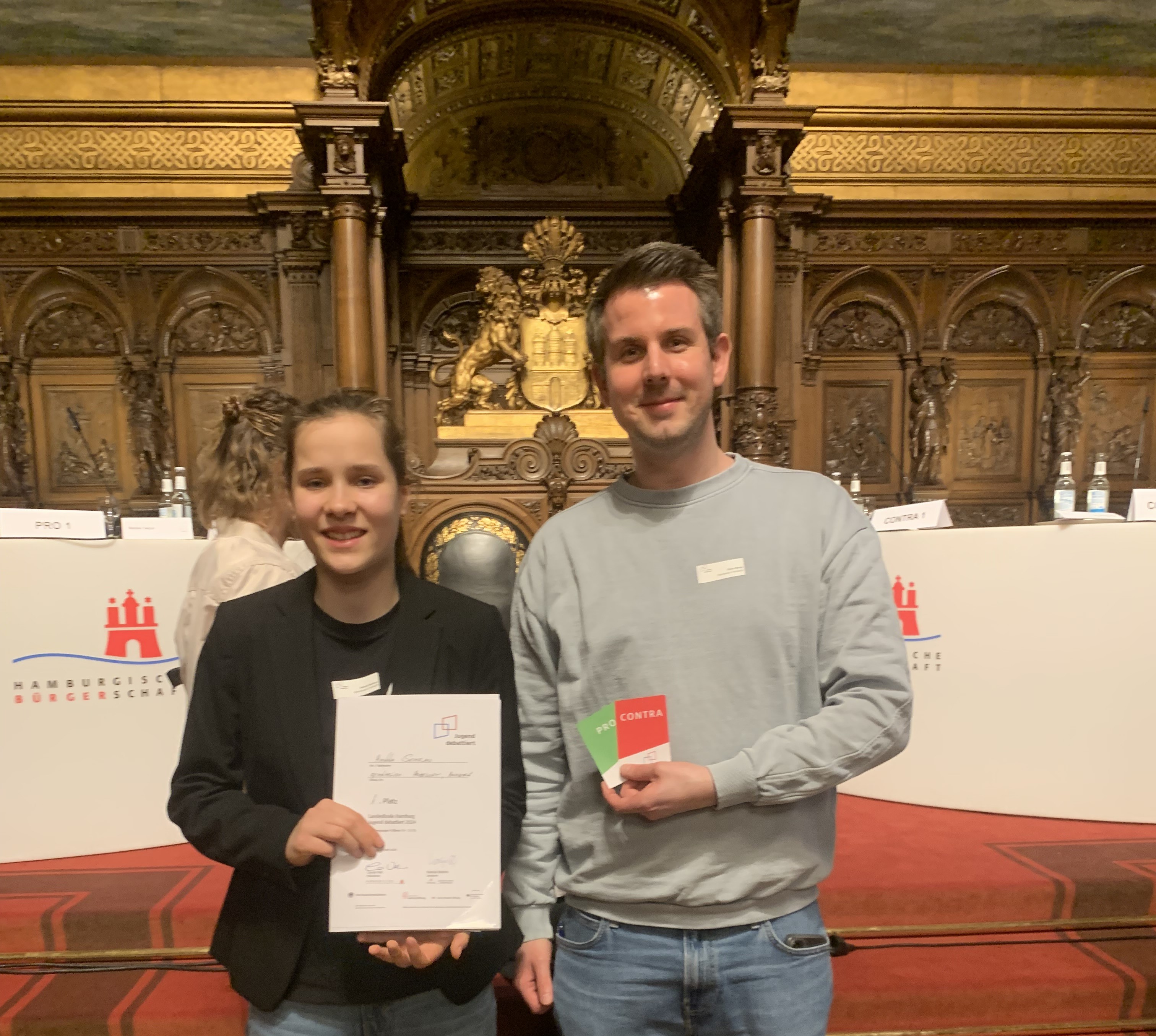 Nachdem sie als Schulsiegerin unsere Schule am 26. Februar 2024 im Verbundswettbewerb am Gymnasium Altona vertrat, bei dem insgesamt acht Schulen mit jeweils zwei Kandidat:innen teilnahmen, erbrachte sie dort eine hervorragende Leistung und wir durften ihr zu einem ausgezeichneten ersten Platz gratulieren. Auch Lynn aus der 9a kam bis ins Finale des Verbundswettbewerbs und belegte dort einen großartigen vierten Platz. Debattiert wurde die Frage: “Soll in Hamburg die Nutzung von mehr als 30 Quadratmeter Wohnraum pro Person besteuert werden?”