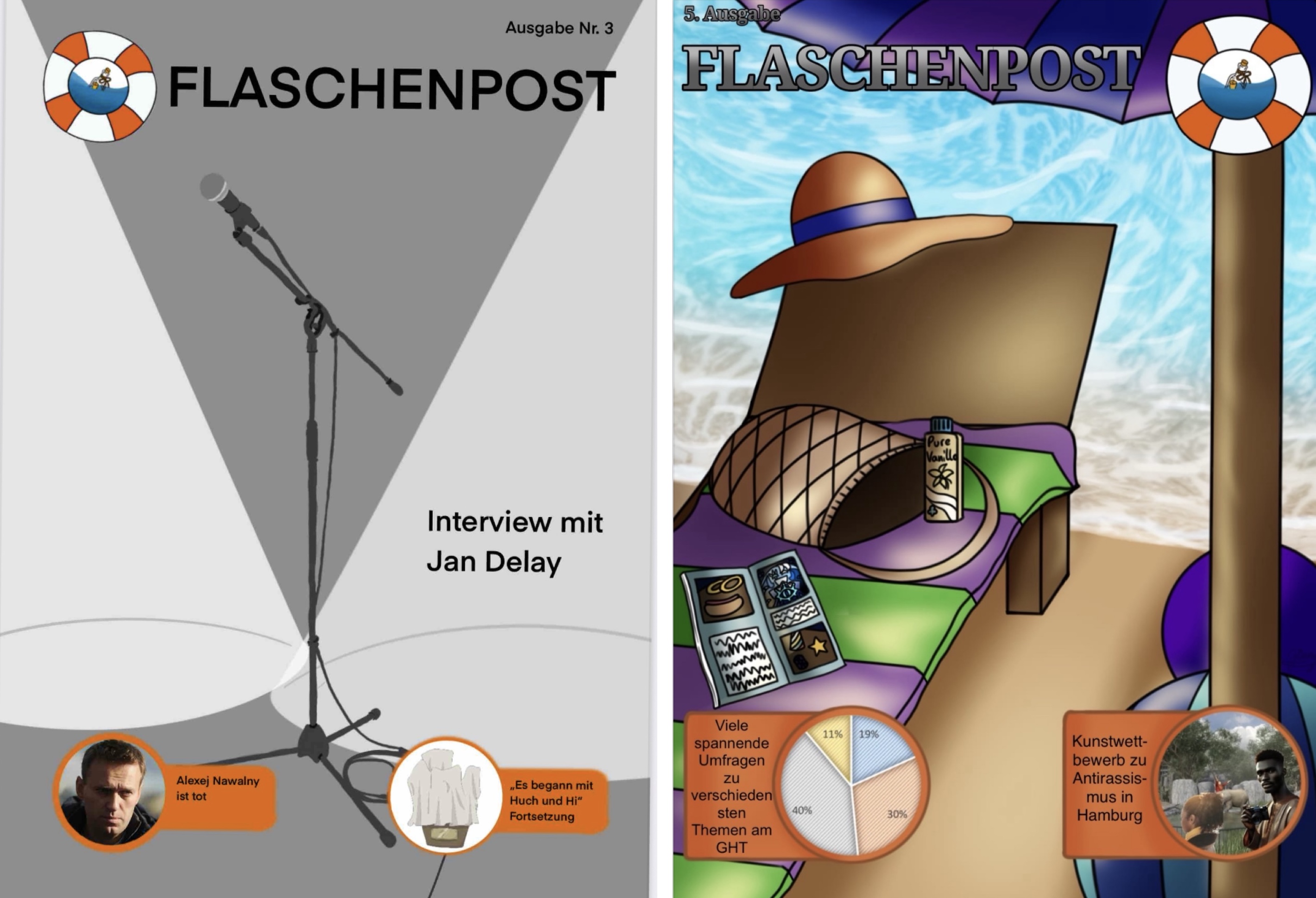 Die aktuelle Flaschenpost gab es beim Sommerfest in diesem Jahr zum ersten Mal in gedruckter Form zu kaufen. Es war etwas Besonders, die Zeitung nun auch in der Hand halten zu können. In dieser Ausgabe gab es wieder einen bunten Mix aus spannenden Artikeln, Umfragen, kreativen Texten und Interviews. Es gab beispielsweise ein Interview mit Verantwortlichen der Klima-AG, das Aufschluss darüber gab, was aktuell im Rahmen der Ziele unserer Klimaschule bewegt wird. In der Umfrage offenbarte besonders das Ergebnis, ob die Mehrheit unserer Schüler:innen und Lehrkräfte den HSV oder St. Pauli unterstützt, wohl eine der der spannendsten Antworten, die in der Flaschenpost zu finden war.