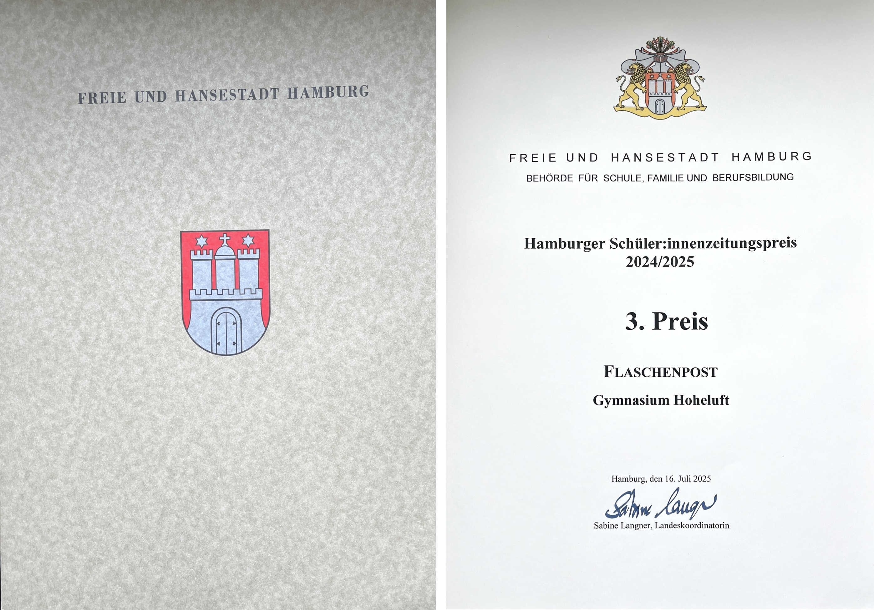 Unsere Flaschenpost-Redaktion wurde am 16. Juli 2025 zur Preisverleihung ins Landesinstitut eingeladen. Dort wurden in einem feierlichen Rahmen die besten Schüler:innenzeitungen Hamburgs verschiedenster Schulformen prämiert. Unsere Redaktion nahm stolz ihre Urkunde und ihr Preisgeld für den 3. Platz entgegen! Herzlichen Glückwunsch!