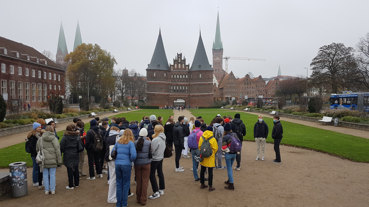 Nachdem bereits vielfältig und differenziert verschiedene inhaltliche und thematische Aspekte des Romans erarbeitet wurden, stand im Rahmen der Fach- und Projekttage eine literarische Exkursion in die Heimatstadt des Schriftstellers Heinrich Mann an. Dieser lässt seinen Roman zwar u.a. in der fiktiven Stadt Netzig spielen, welche aber durchaus mit seiner Heimat Lübeck verknüpft ist.