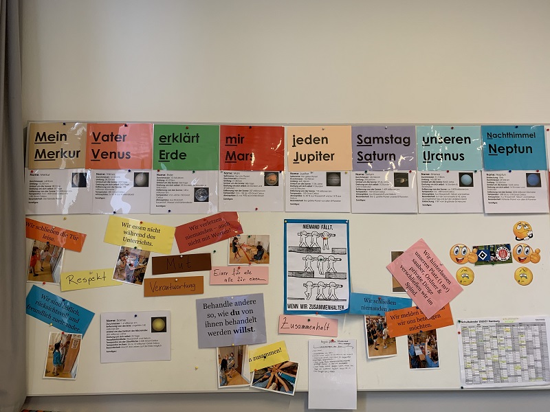Zusammen mit einem bunt gestalteten Merksatz an der Wand fällt es allen nun leichter, sich die Planetenfolge vorzustellen.
