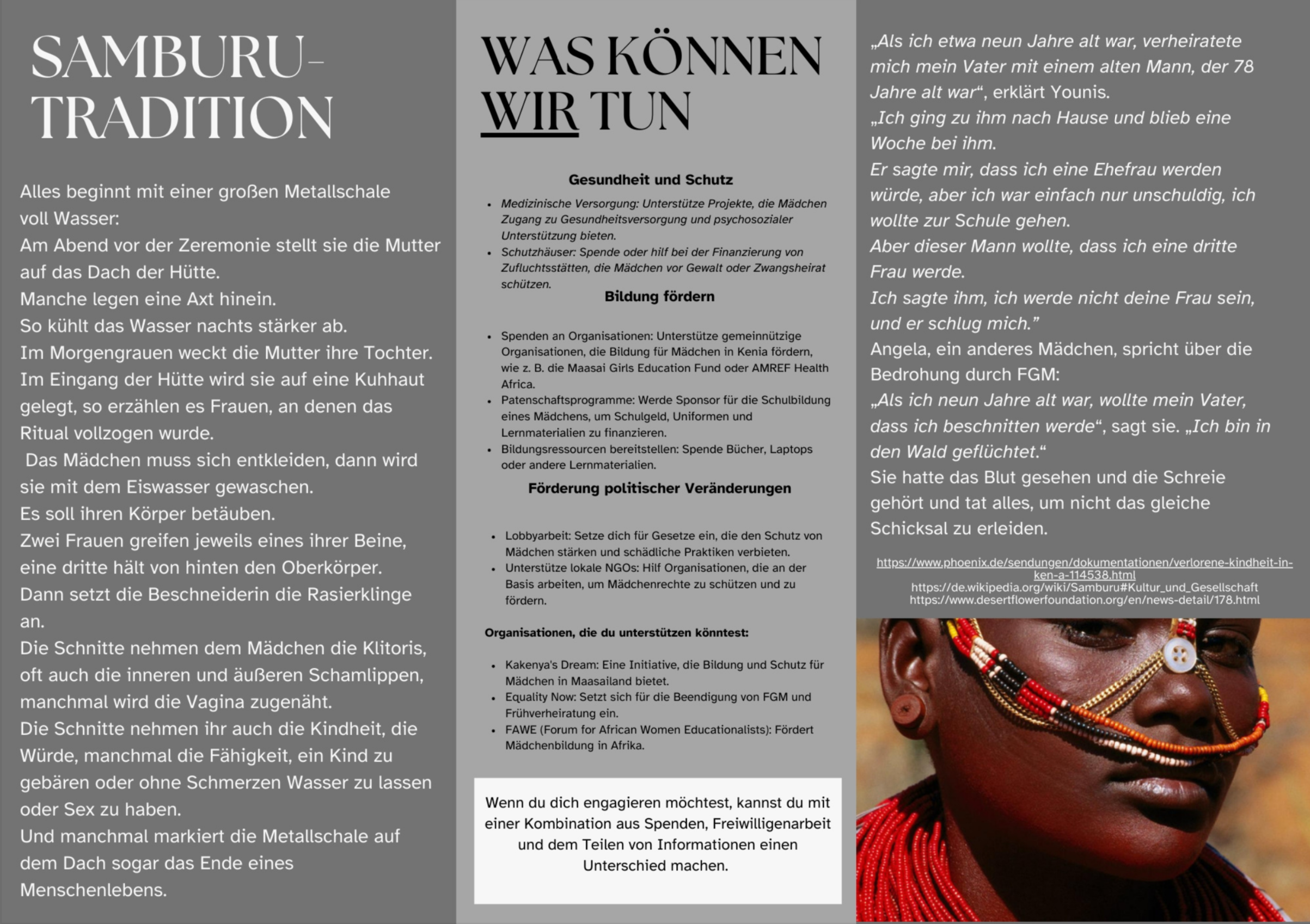 Zum Abschluss der Einheit haben die Schüler:innen des 10. Jahrgangs Broschüren entworfen, die über Probleme bezüglich globaler Gerechtigkeit informieren und aufmerksam machen sollen. Bringt doch eh nix? Wem ist damit geholfen? Zugegeben, es ist nur ein erster Schritt, doch wer ist ohne diesen je ans Ziel gekommen?