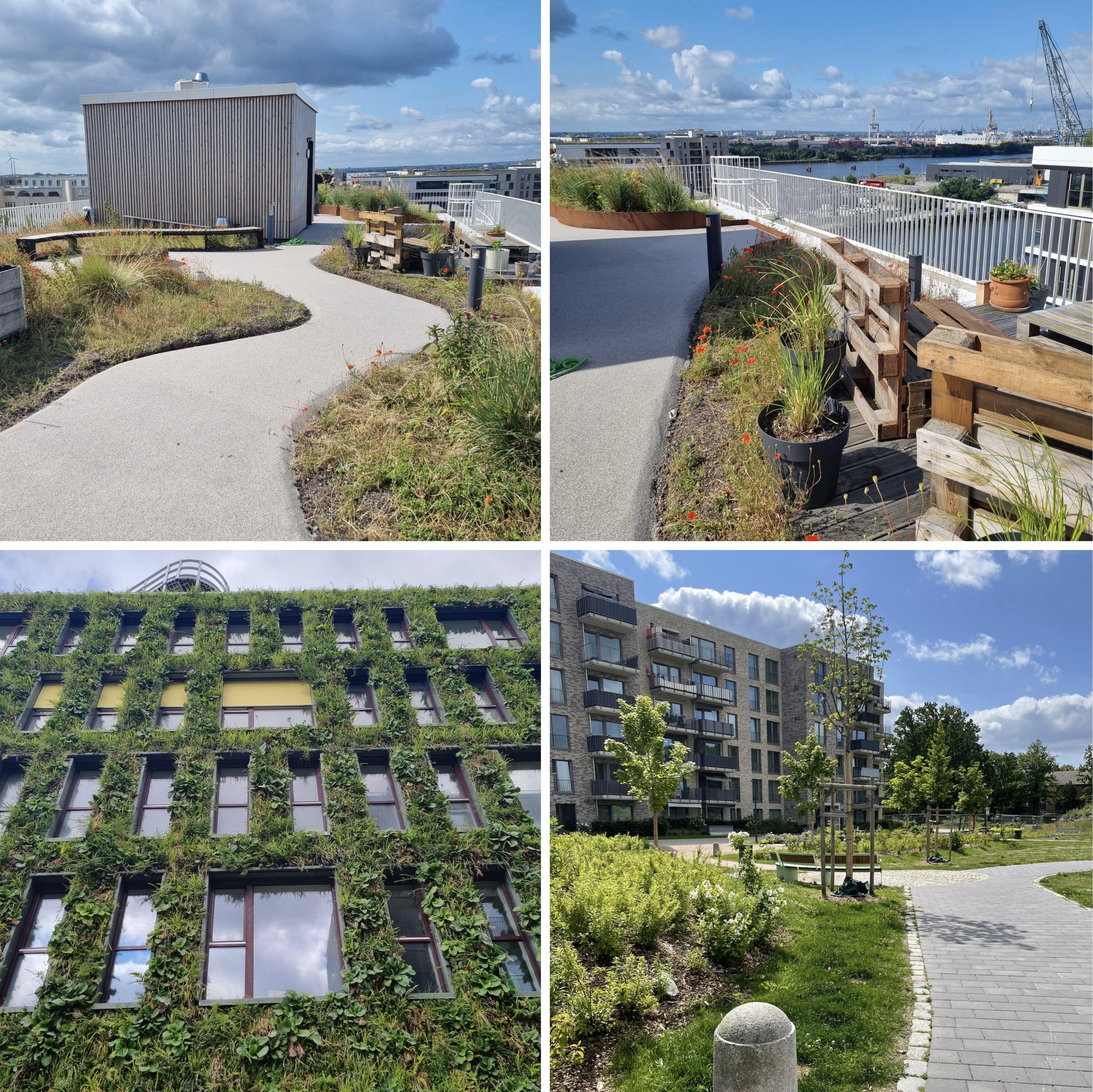 Die beiden letzten Tage der Woche wurden genutzt um vor Ort zu schauen, wie Hamburg städtebaulich auf die extremer werdenden Wetterereignisse vorbereitet ist. In arbeitsteiligen Exkursionen wurden begrünte Fassaden und Dächer in Wilhelmsburg und St. Pauli erkundet, die Sturmflutschutzmaßnahmen der Stadt begutachtet, Grünflächenprojekte des Bezirks Eimsbüttel kennen- und verstehen gelernt sowie ein nachhaltiges Hauskonzept des Schwammstadtprinzips erforscht. Die Ergebnisse der Exkursionen wurden dann, genauso wie best- und worst practice-Beispiele in eine digitale Karte übernommen und vorgestellt. Ebenso wurden in die Karte mit KI erzeugte Bilder von den worst practice-Beispielen eingebaut und hier der Nutzen von KI-basierten Bildern diskutiert.