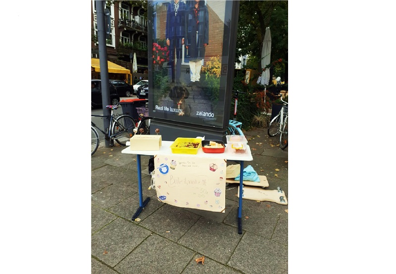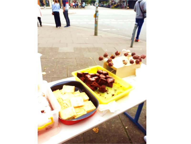 Wir hatten die Idee, Kuchen zu backen und ihn dann zu verkaufen. Da das Geld dem Stadtteil (Eimsbüttel) zugute kommen sollte, haben wir das Geld an Hinz und Kunzt gespendet, das ist eine Organisation, die Obdachlose unterstützt.