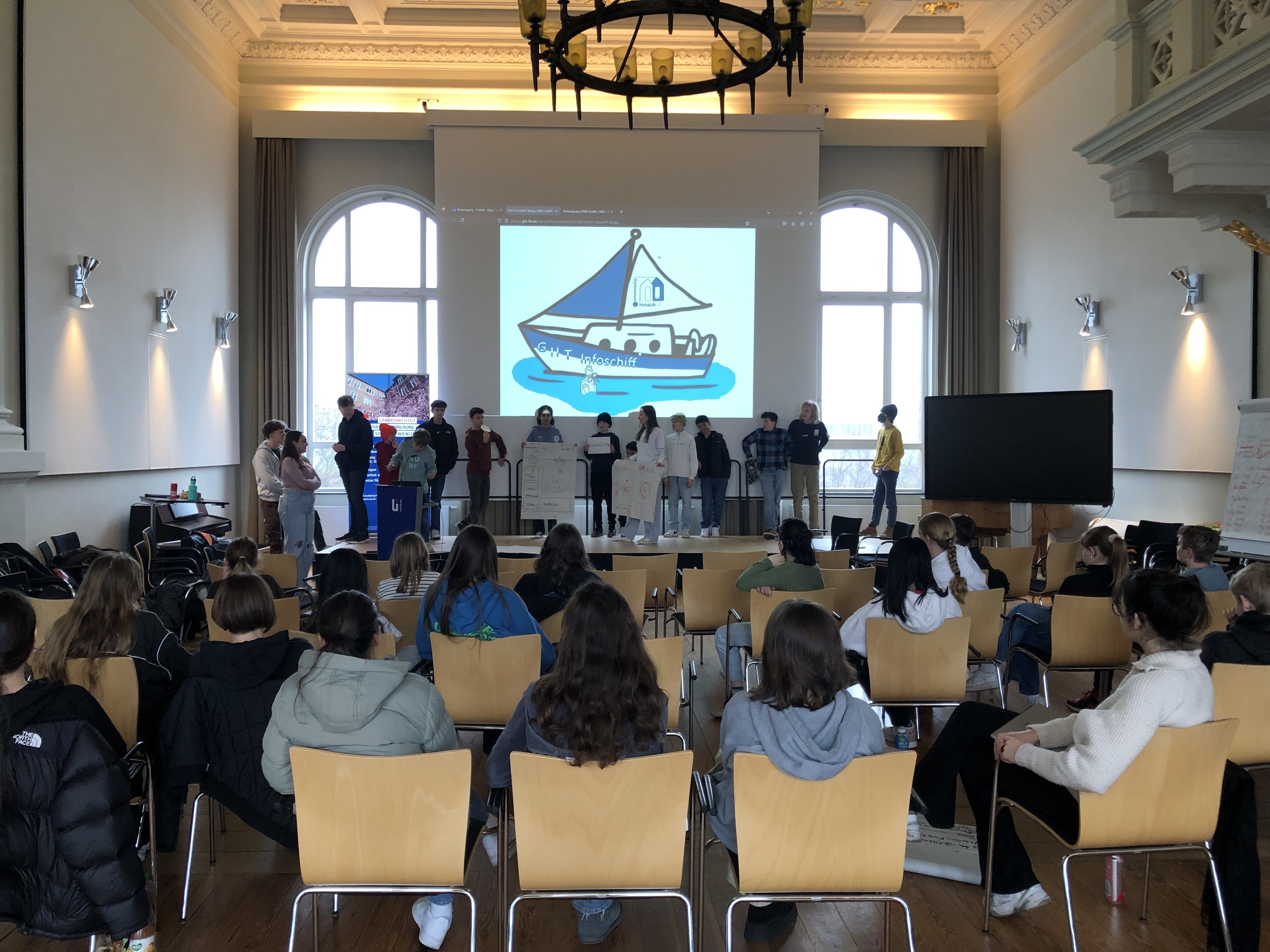 Das Schulsprecherinnenteam lud alle Klassensprecher:innen zum GHT-Planungstag ins Landesinstitut ein. Ziel der Schulsprecherinnen Jonna, Hana-Bi, Luana und Michelle war es, die Schulgemeinschaft durch gemeinsames Arbeiten an Projekten zu stärken. Zusammen mit der Verbindungslehrerin Frau Schüler wurden Aktionstage geplant. Zum Nikolaus sollen beispielsweise künftig (Schoko-) Nikolausgrüße verschickt werden können. Der Gesundheitsbeauftragte Herr Dobrick unterstützte eine Gruppe von Klassensprecher:innen dabei, eine Umfrage zu entwickeln, damit mit den Ergebnissen Maßnahmen zur Stärkung der Gesundheit und des Wohlbefindens getroffen werden können. Frau Mönnich begleitete als Teil der in diesem Halbjahr ins Leben gerufene Redaktion der Schüler:innenzeitung den Ideenprozess der Klassensprecher:innen: Welchen Namen soll die Zeitung bekommen? Welche Ressorts und Themen sollen Platz finden? Soll sie digital und/oder analog erhältlich sein? Wie könnte das Logo aussehen? – Die Schüler:innenredaktion hat die Ideen des Planungstages bereits aufgenommen und gestaltet gerade eifrig die allererste GHT-Schüler:innenzeitung. Die Ergebnisse werden Sie und euch voraussichtlich am Ende des Schuljahres in Form der ersten Ausgabe erreichen!