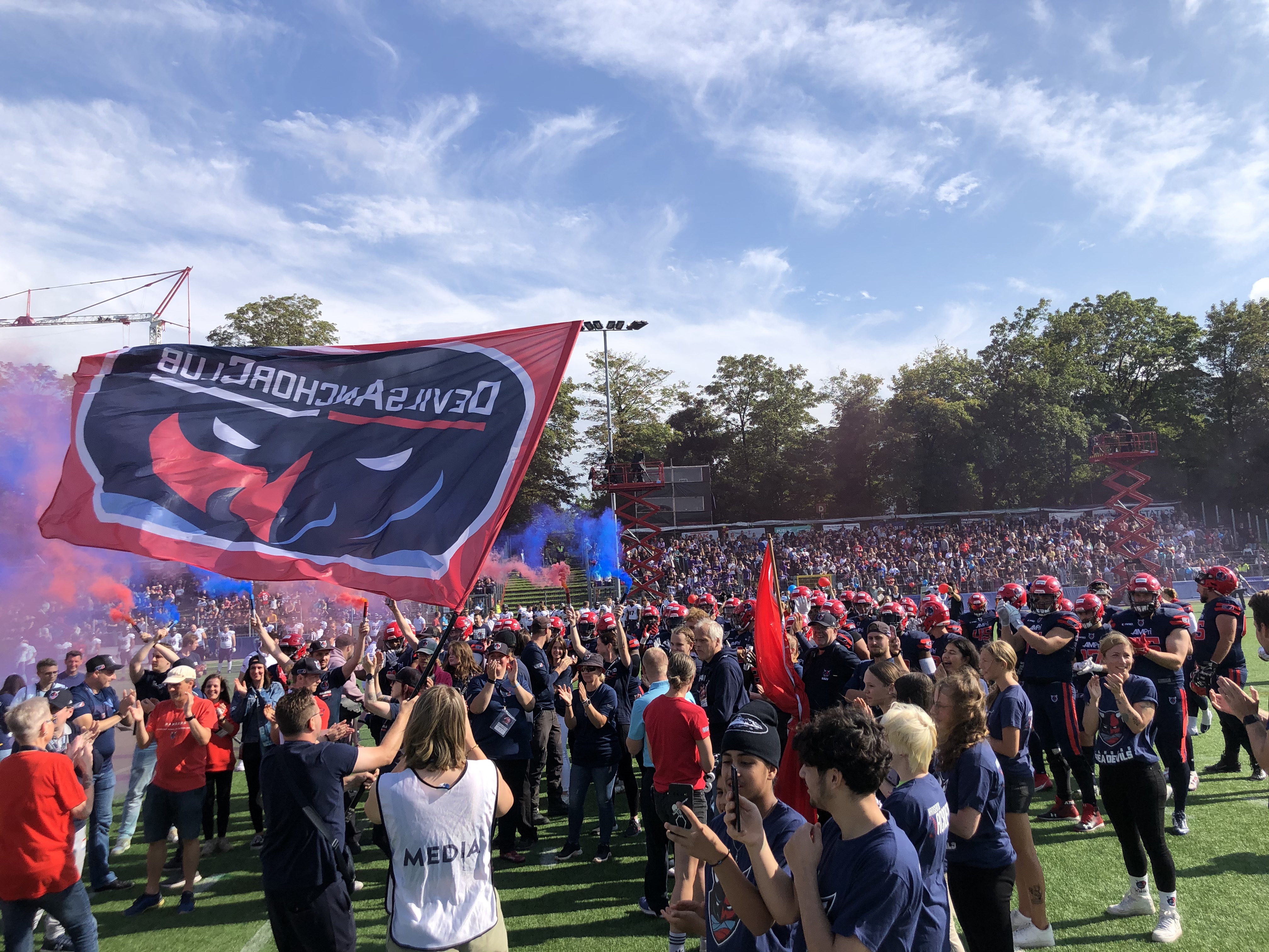 Am Sonntag, den 27. August 2023, war unsere Klasse 8a zum letzten Saison-Heimspiel der Hamburger Sea Devils im Stadion Hoheluft eingeladen. Während die Bundesligaspieler einliefen, standen die Schüler:innen auf dem Spielfeld in Sea-Devils-Shirts Spalier. Kickoff war um 16:25 Uhr. Nach ca. 3,5 Stunden Spielzeit hatten die Schüler:innen die Gelegenheit, zu den Spielern auf das Spielfeld zu gehen, um sich zu unterhalten und Autogramme zu holen.