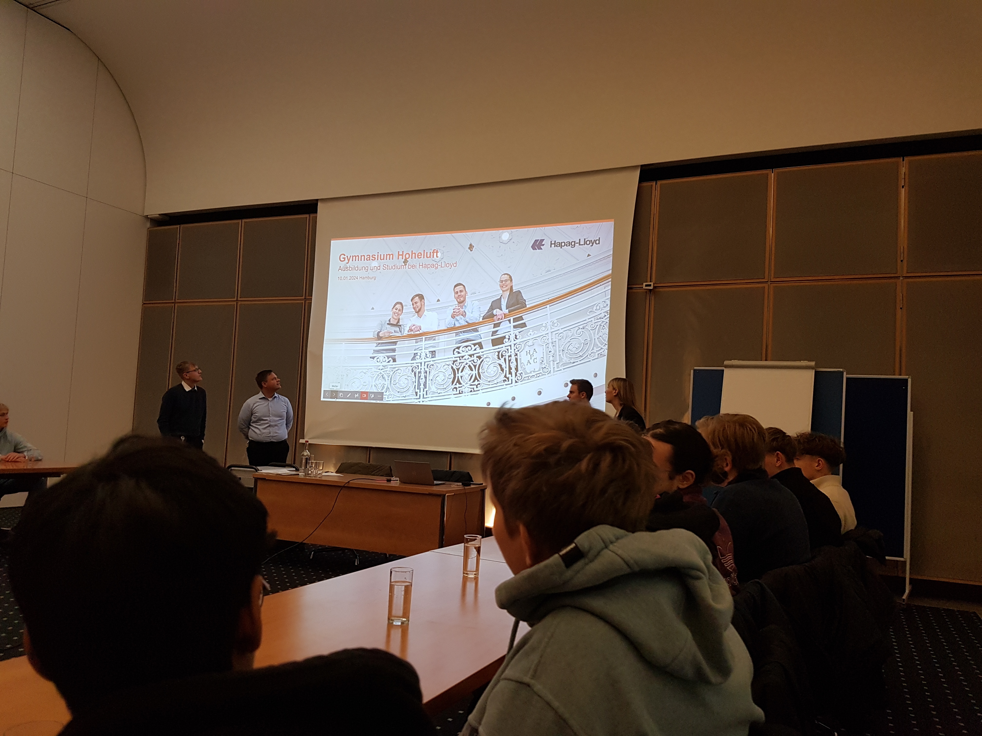 Rund 20 interessierte Schülerinnen und Schüler der Jahrgangsstufen 11 und 12 folgten auf freiwilliger Basis an ihrem freien Mittwochnachmittag dem Angebot, duale Studiengänge und Ausbildungswege bei einer der weltgrößten Containerreedereien der Welt, Hapag-Lloyd, kennenzulernen. Vor Ort am Hauptsitzt am Ballindamm staunten die Schüler:innen nicht schlecht, als sie mit Lennart einen Absolventen unserer Schule trafen, der bei Hapag-Lloyd aktuell eine Ausbildung zum Schiffahrtskaufmann absolviert. Zusammen mit einem weiteren Auszubildenden und zwei Dualstudierenden stellte er das Unternehmen sowie die Ausbildungs- und Studienmöglichkeiten bei Hapag-Lloyd vor. Es schloss sich eine rege Fragerunde rund um die Themen Ausbildung und Studium an, wobei sowohl die Vorteile als auch die Nachteile eines dualen Studiums thematisiert wurden. Zum Schluss gab es neben vielen persönlichen Gesprächen in Kleingruppen auch die Möglichkeit, mit Hilfe eines Planspiels u. a. Frachtraten zu berechnen, um so genauere Einblicke in den Berufsalltag eines Schifffahrtskaufmanns zu bekommen. Die Schüler:innen sprachen nach den 2 1/2 Stunden von einer sehr gelungenen Veranstaltung, da sie einen sehr konkreten Einblick in die Berufs- und Studienorientierung bei einem großen Unternehmen bekommen konnten und die Themen Ausbildung und duales Studium für sie direkt erfahrbar wurden.