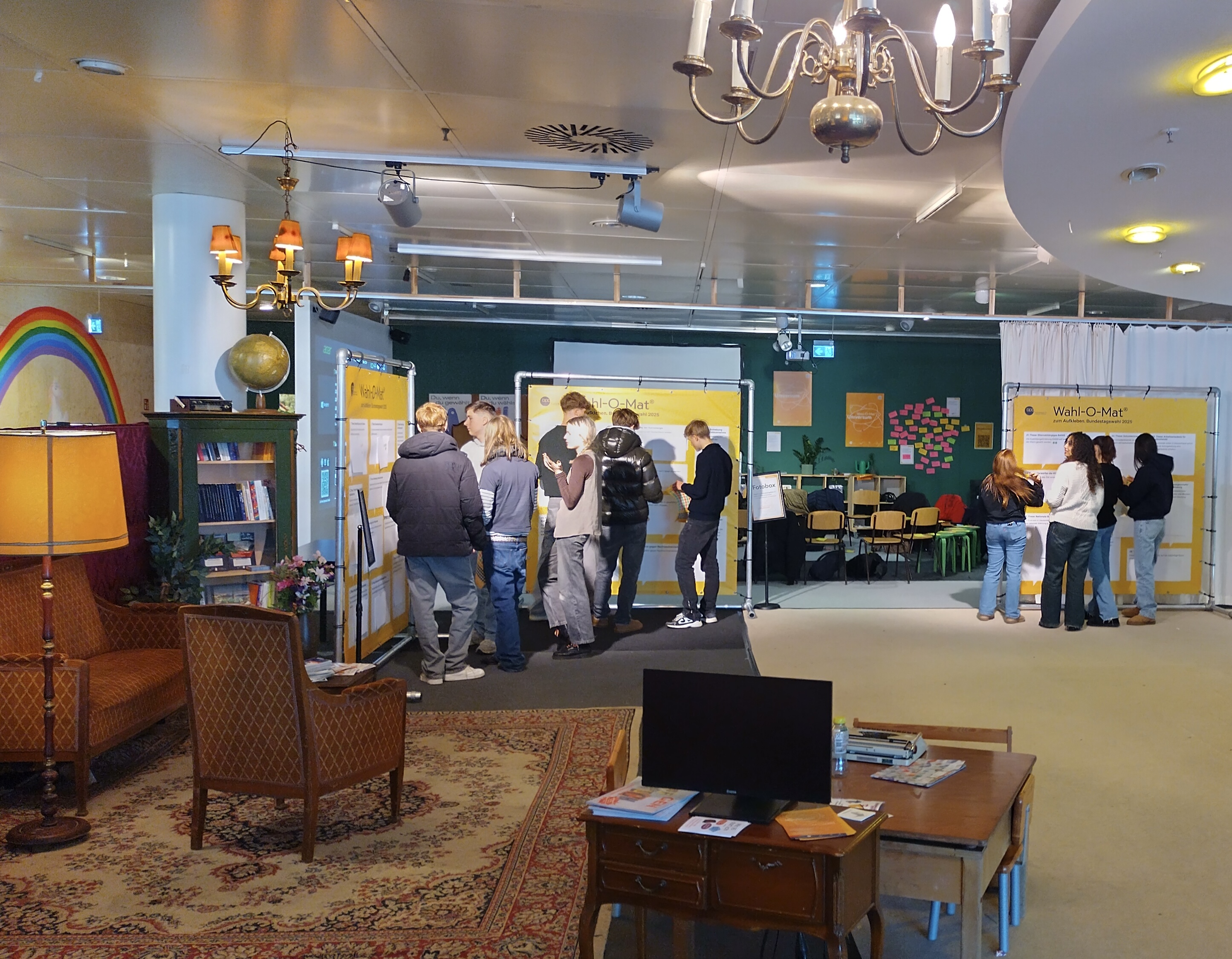 Im Anschluss wurde der sogenannte analoge Wahl-O-Mat erklärt – ein Tool, das Wähler:innen hilft, ihre politischen Präferenzen mit den Positionen der Parteien zu vergleichen. Wir hatten die Gelegenheit, dieses Tool selbst auszuprobieren, wobei die Moderatorinnen uns unterstützen, Fragen zu den einzelnen Thesen zu beantworten.