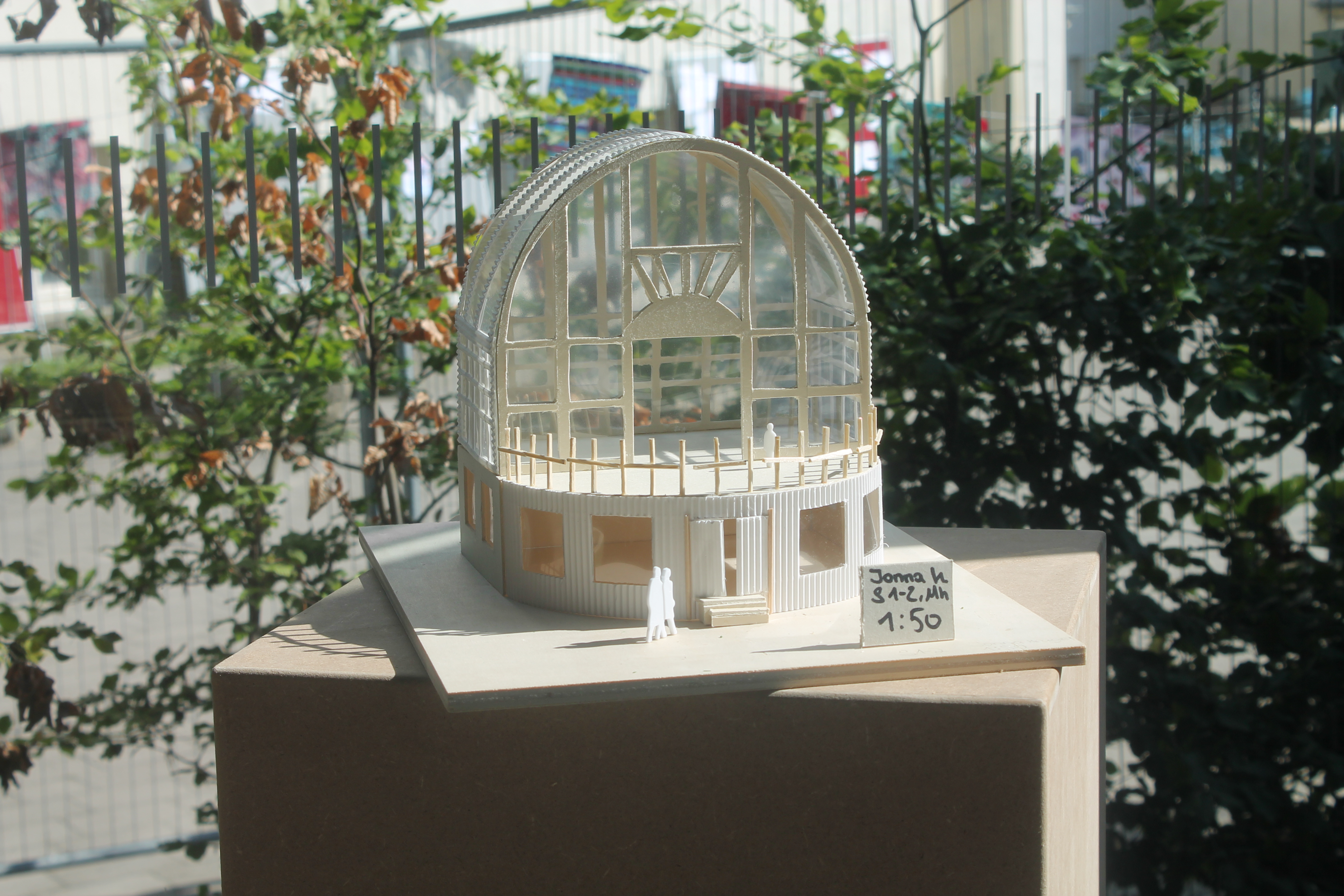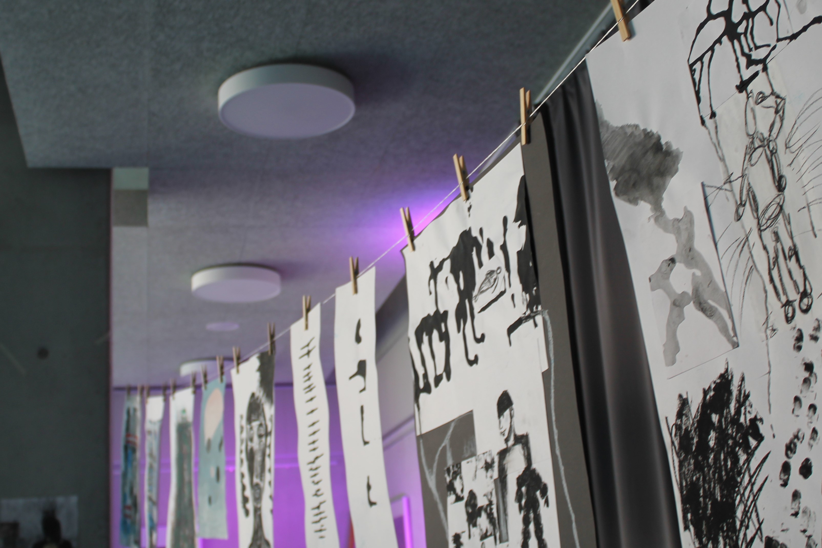 Der Profilkurs Kunst des elften Jahrgangs hat für das diesjährige Sommerfest die besten Ergebnisse des ersten und des zweiten Semesters zu einer Ausstellung zusammengestellt. In dem sich rechts vom Deck befindenden Raum wurden sowohl Selbstportraits und verschiedenste Malereien und Zeichnungen aus dem ersten Semester als auch die im zweiten Semester entstandenen Modellbauten und Plakate ausgestellt. Mit den Modellbauten und Plakaten ging die Teilnahme an dem Wettbewerb Open Space der Hamburger Architektenkammer einher. Die Schüler:innen fertigten dafür Konzepte für ein nachhaltiges Bauwerk in einem sogenannten Open Space an, die sie anschließend mit Modellen aus verschiedenen Materialien visualisierten. Es wurde unter anderem das Modell von Malina Schütz (11c) ausgestellt, das beim Wettbewerb den vierten Platz belegte.