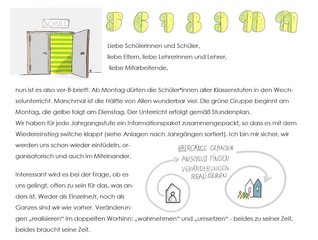 Das ganze Schreiben und die Anhänge für die einzelnen Jahrgängen finden sich auch hier auf der Website im Eltern-Schüler*innen-Bereich.