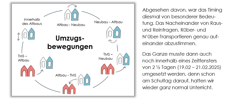 In der langen Liste von Umzügen im Laufe der kurzen Geschichte unserer Schule reiht sich nun auch dieser ein. Dabei bewegten wir uns allerdings auf einem anderen Anspruchsniveau, denn es gab zwischen Alt-, Neubau und Telemannsstraße keine Bewegungsrichtung, die wir nicht zu realisieren hatten.