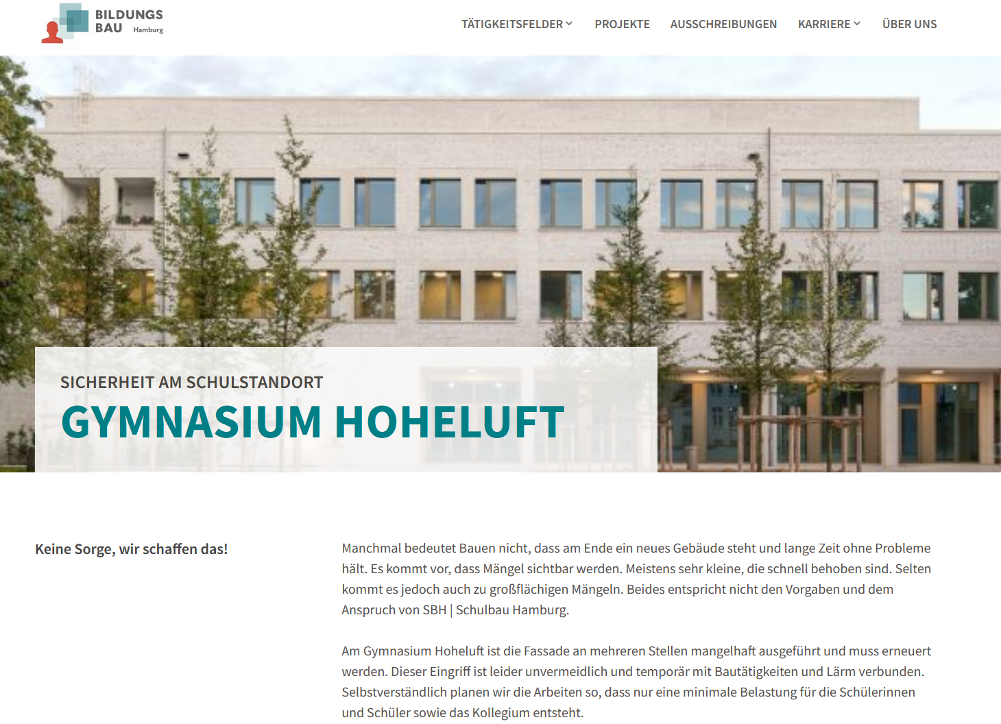 Diese Website von Schulbau Hamburg (SBH) gibt einen Überblick über das Bauvorhaben und den aktuellen Status. In regelmäßigen zeitlichen Abständen wird dieser Status aktualisiert.