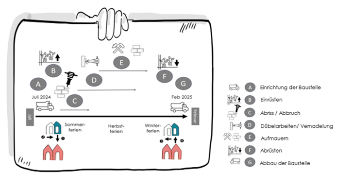 “Im Sommer 2024 werden die Sanierungsmaßnahmen an der Fassade umgesetzt. Man hat mir mittlerweile mitgeteilt, dass die gesamte Fassade abgenommen und eine beträchtliche Zahl von Verankerungen angebracht werden muss, bevor dann die neue Fassade wieder aufgebaut wird. Kurz gesagt: Nachher wie vorher, nur heile.